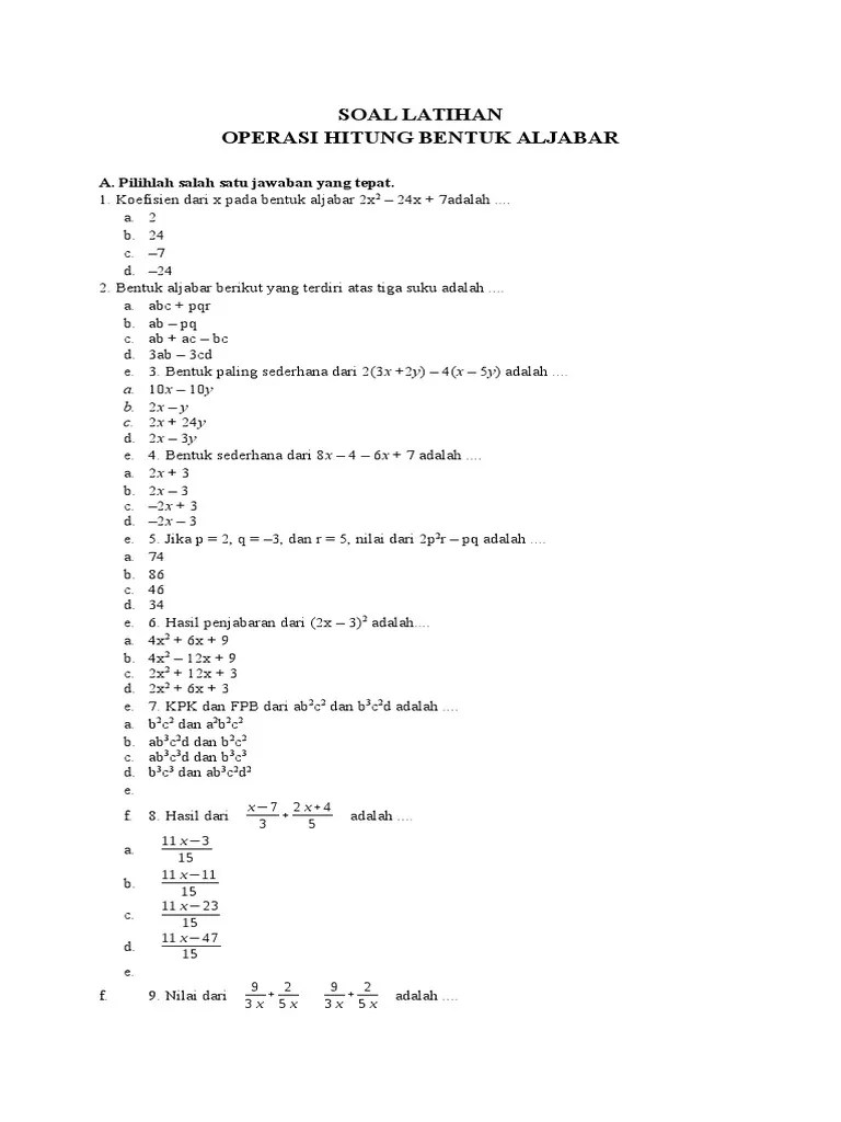 Contoh soal aljabar kelas 7 smp plus jawaban dan pembahasan juragan les soal dan kunci jawaban Situs tentang kumpulan soal sd, smp, sma, cpns dapat di download gratis sepenuhnya milik anda. Anis faozi tes kemampuan umum matematika bagian #1 soal dan pembahasan . Pdf soal matematika kelas 7 smp mts kurikulum 2013 pdf zaenal. Soal dan pembahasan operasi hitung pada bentuk aljabar part 2.