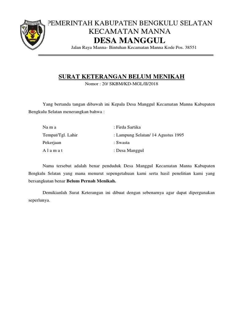 Budaya pampang dan belum pernah menikah / melaksanakan akad nikah. Desa sinar rambang kode pos 31131 surat . Pertamina kso indo spec ltd. Surat pernyataan belum pernah menikah. Klik untuk contoh (termasuk di.